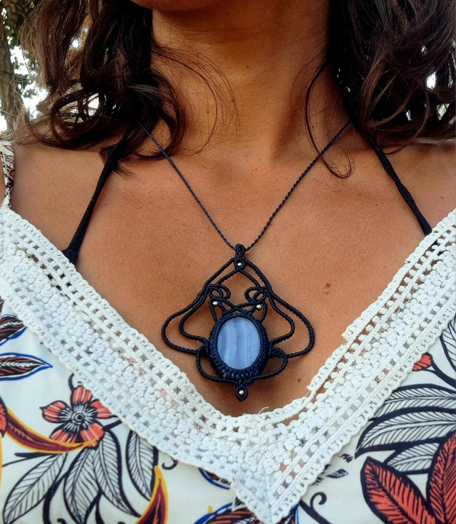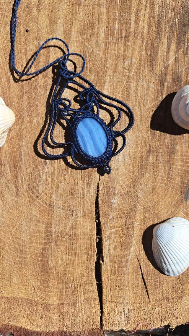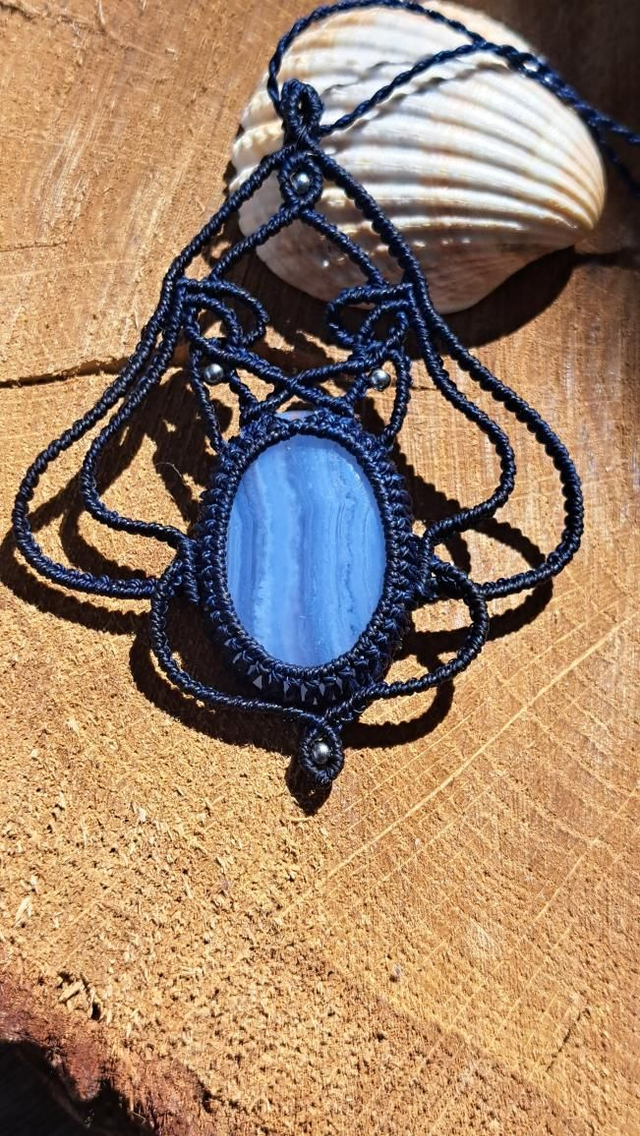 Collier effet médaillon très beau par ses formes et sa pierre agate bleu lace