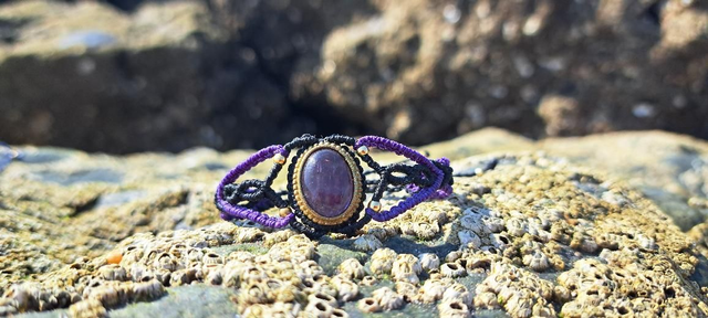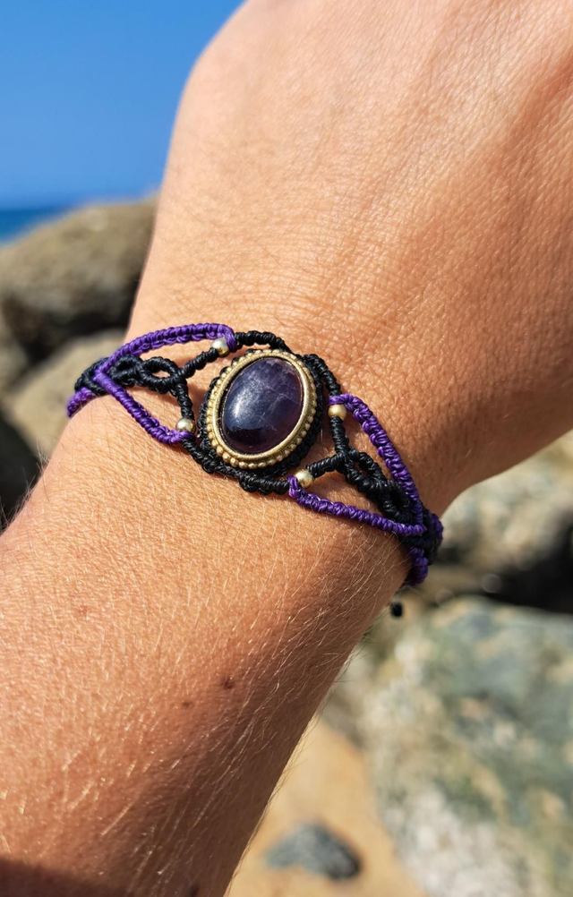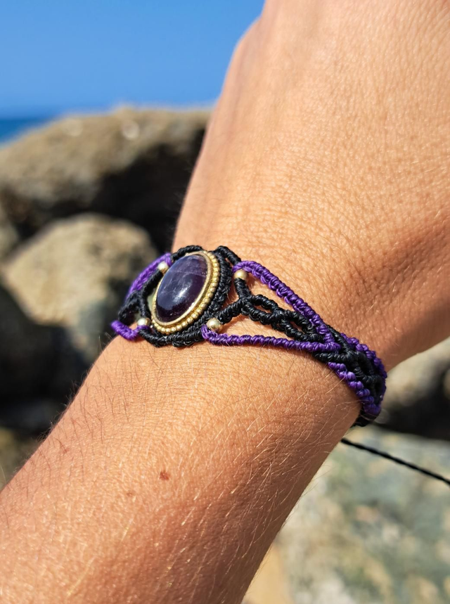 Très belle manchette en micro-macramé avec pierre naturelle améthyste