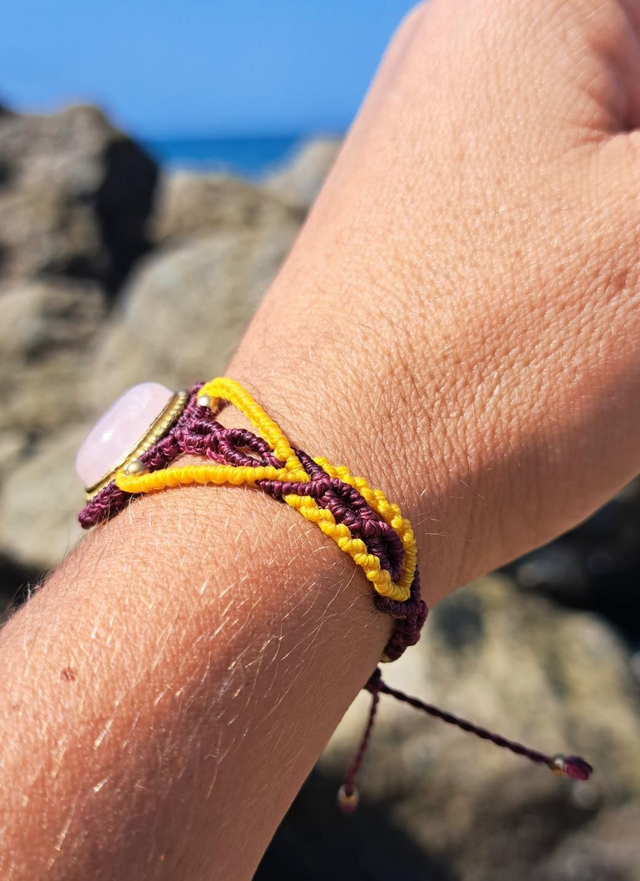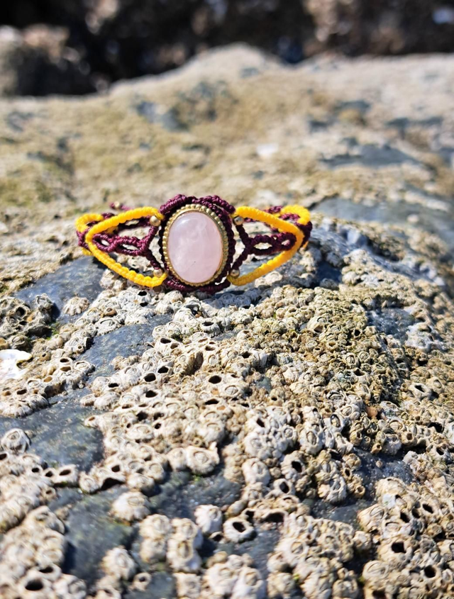 Très belle manchette en micro-macramé avec pierre naturelle quartz rose